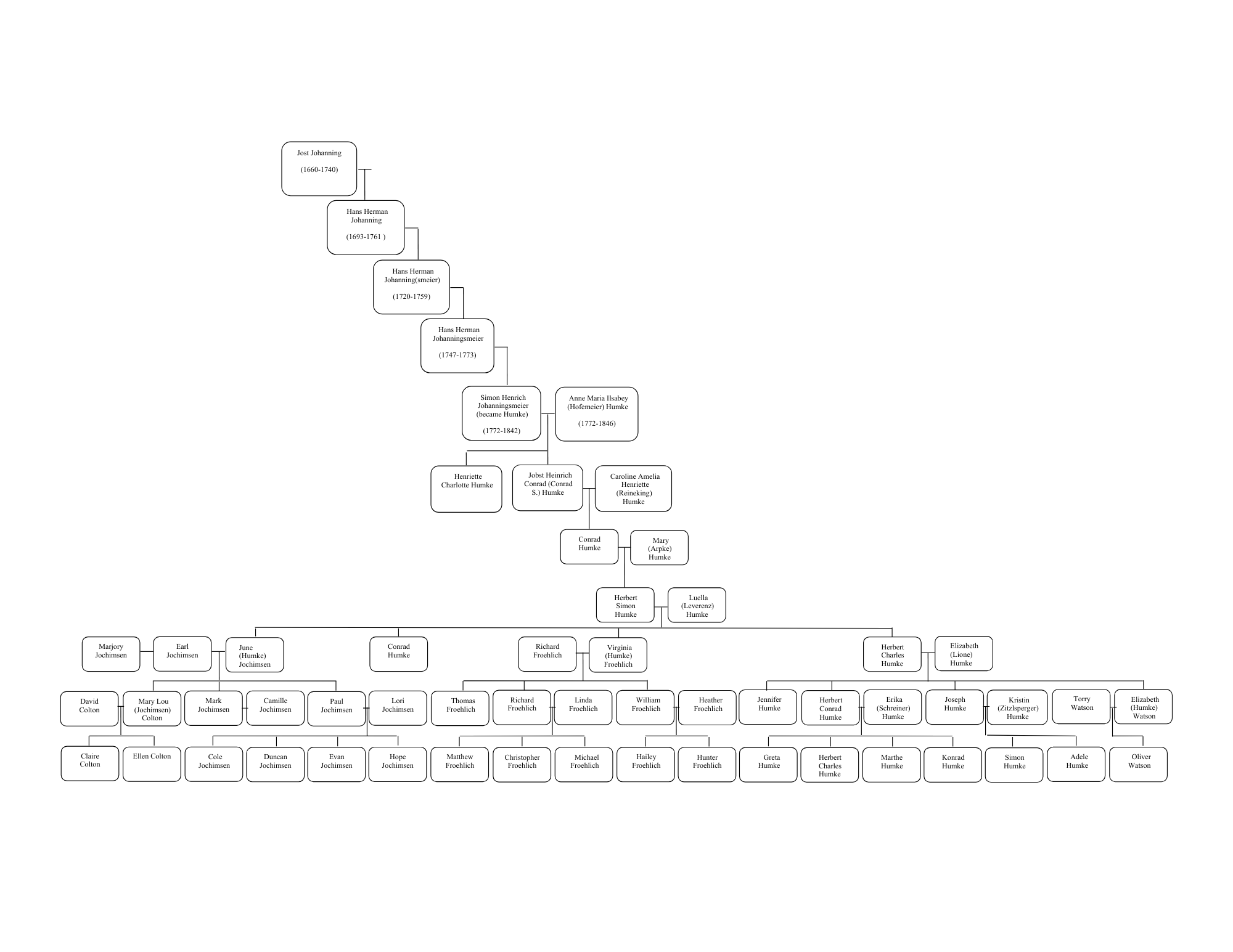 This family tree is based on information derived from free Internet searches. In some cases, a bit of a leap of faith is taken. There was a time before which Humke was not the family surname – it appears to have been Johanningsmeier (or some derivation thereof). There is a fair amount of information available regarding Johanningsmeier family history. This tree attempts to link the Humke name to the correct line of the Johanningsmeier family, and there is good reason to believe it is accurate. However, it is not a certainty.